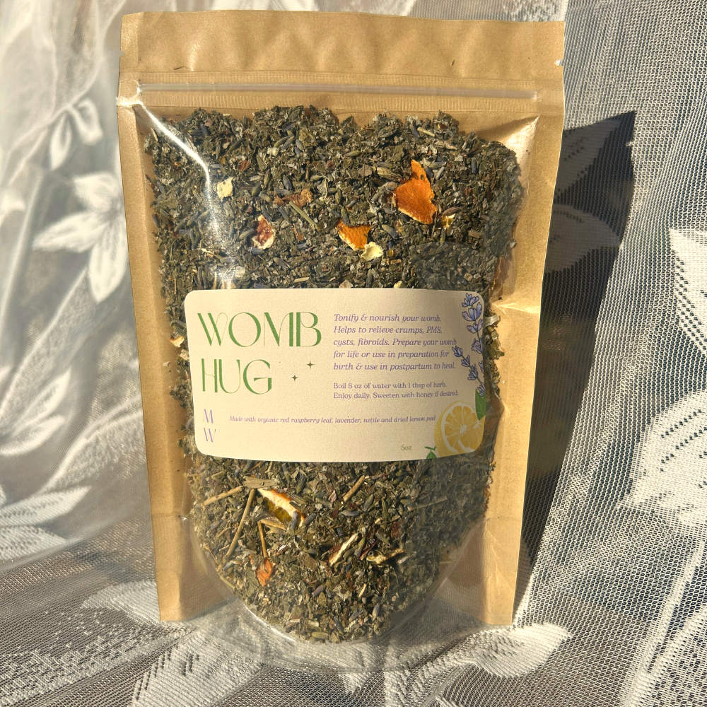 Womb Hug Tea is a gentle, nourishing herbal blend designed to support mothers beginning in the second trimester. Crafted with red raspberry leaf, lavender, nettle, and dried orange peel, this tea strengthens and tones the uterus, supports optimal nutrient levels, and helps prepare the body for a smoother, more efficient birth.